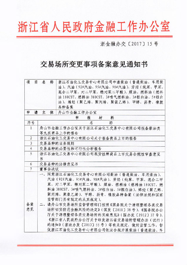 浙金融辦交〔2017〕15號 交易場所變更事項備案意見通知書