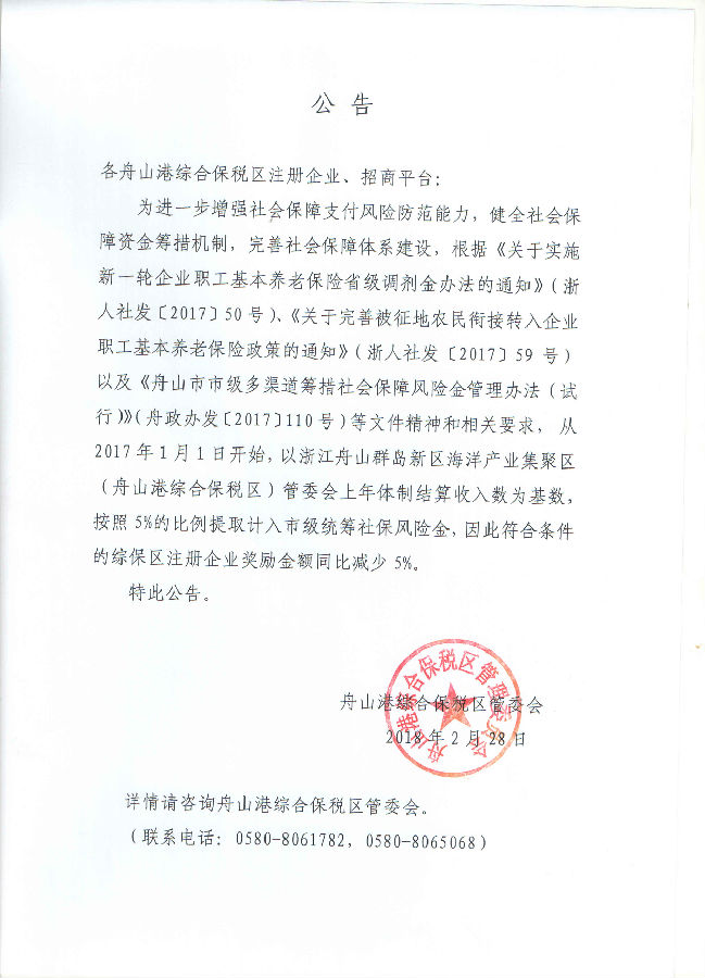 舟山港綜合保稅區(qū)管委會(huì)關(guān)于計(jì)提社保風(fēng)險(xiǎn)金的公告(企業(yè)獎(jiǎng)勵(lì)金額同比減少5%)