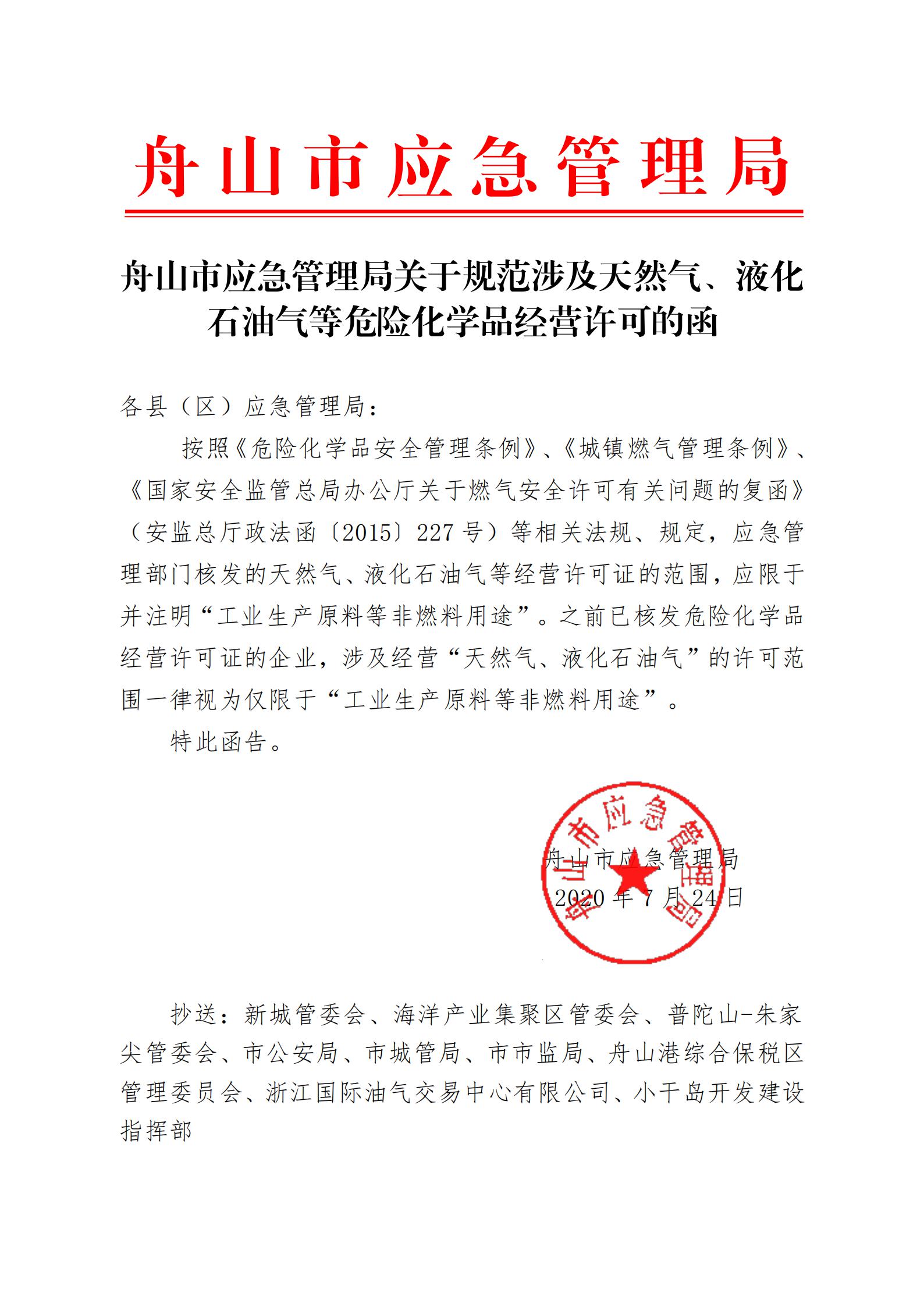 舟山市應(yīng)急管理局關(guān)于規(guī)范涉及天然氣、液化石油氣等危險(xiǎn)化學(xué)品經(jīng)營(yíng)許可的函