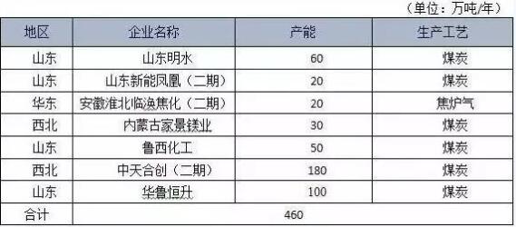 2017年中國甲醇行業(yè)將繼續(xù)新增460萬噸的甲醇產(chǎn)能,屆時中國甲醇年生產(chǎn)能力將達到8000多萬噸。在此些新建項目中,西北地區(qū)約210萬噸,所占比例大45.65%;山東地區(qū)230萬噸,所占比例50%;華東地區(qū)20萬噸,所占比例4.35%。詳細列表如下所示: