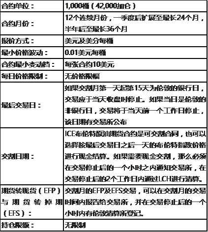 布倫特原油一般通過ICE布倫特原油期貨合約進(jìn)行交割,該合約可以進(jìn)行實(shí)物交割,同時(shí)可以選擇期轉(zhuǎn)現(xiàn)進(jìn)行結(jié)算。合約標(biāo)準(zhǔn)如下: